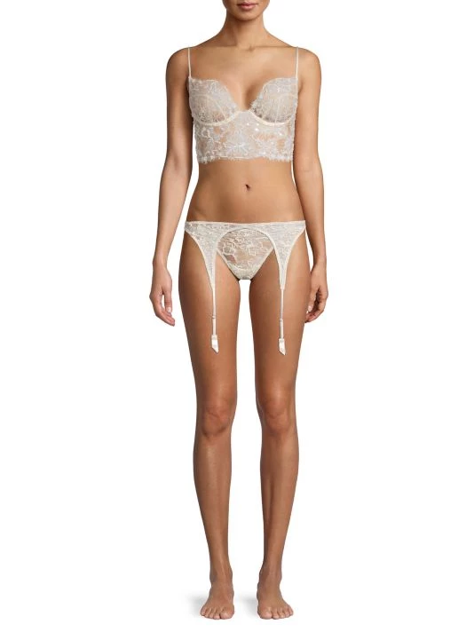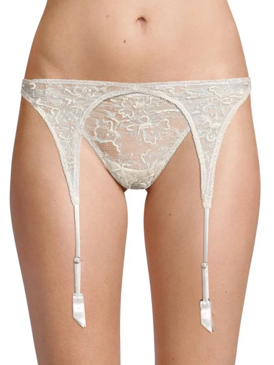 This sexy garter belt features a delicate lace construction, intricate beading, and adjustable straps.