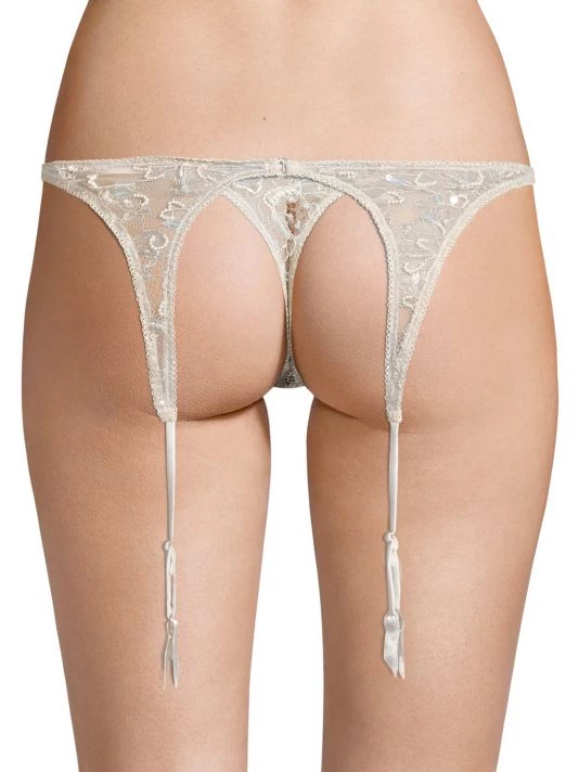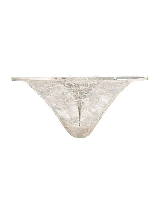 This sexy thong flaunts a delicate lace construction, intricate beading, and silk charmeuse trimmings.