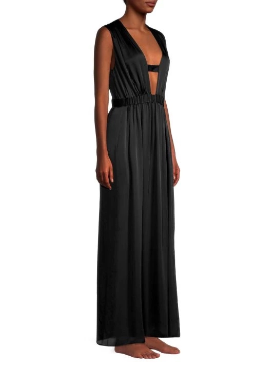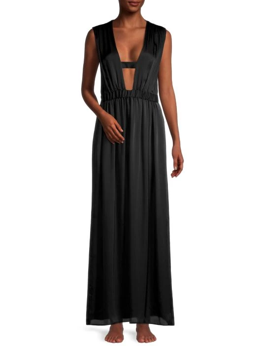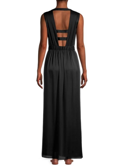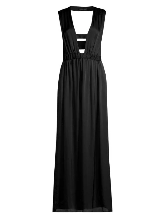 This elegant silk dress flows effortlessly from a plunging neckline with bar detail, mirrored by a backless design.