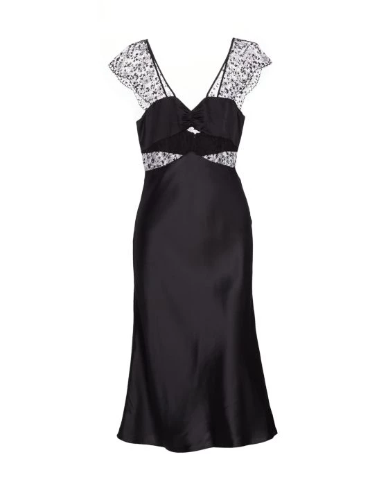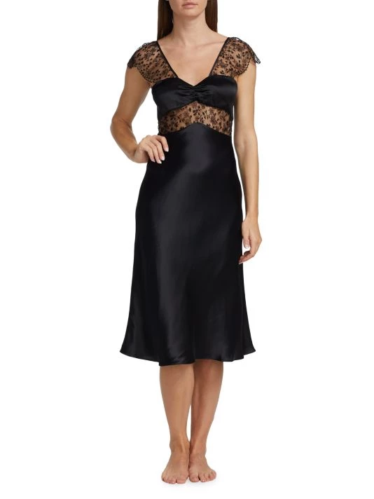 The Cecile slipdress from Kiki de Montparnasse features a V-neck with a gathered bust and lace paneling. Delicate scalloped lace cap sleeves complete this smooth, satin style.