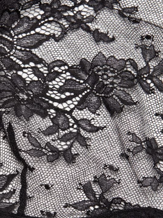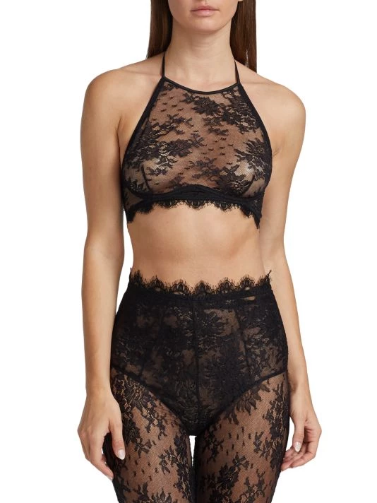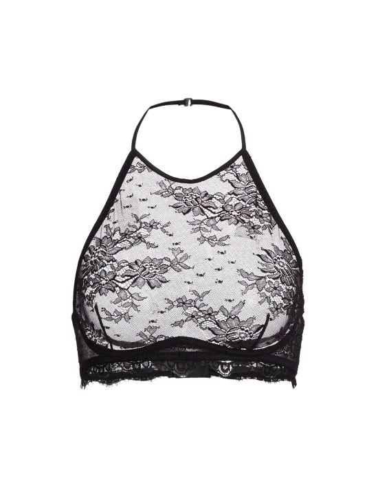 The Jolie underwire bra from Kiki de Montparnasse features a halterneck and open back. Delicate eyelash lace defines this unlined, sheer style.