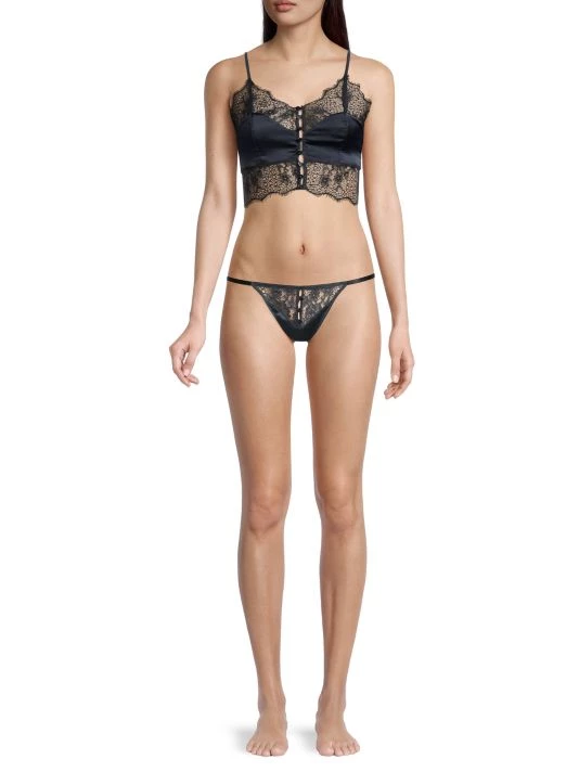 Channel kiki’s parisian-chic sensibility in this longline bra. The soft-cup style is crafted from black french lace and lustrous midnight blue silk charmeuse. Adjustable shoulder straps ensure a perfect fit while front-button closure makes for built-in play.