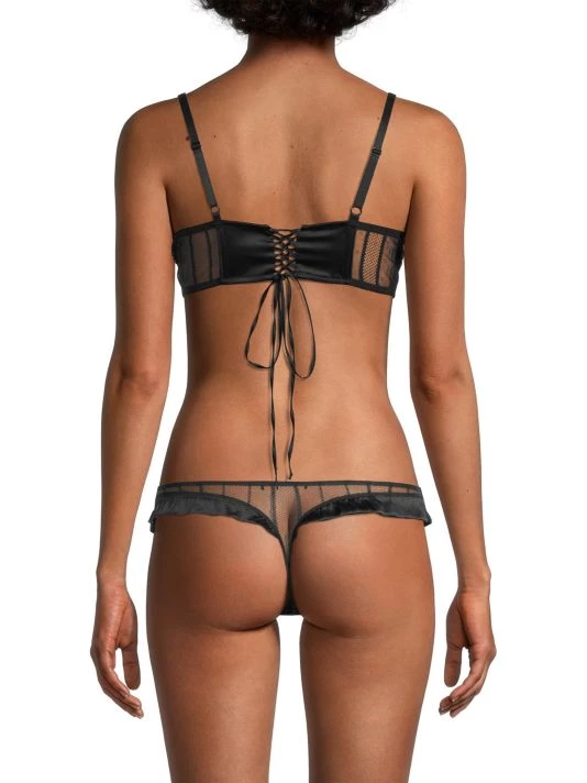 Sultry soft-cup style is crafted from black french lace and lustrous black stretch-silk charmeuse. Adjustable shoulder straps ensure a perfect fit while the tantalizing front hook closure make the Muse Corselette a timeless and chic must-have for any KIKIDM connoisseur.