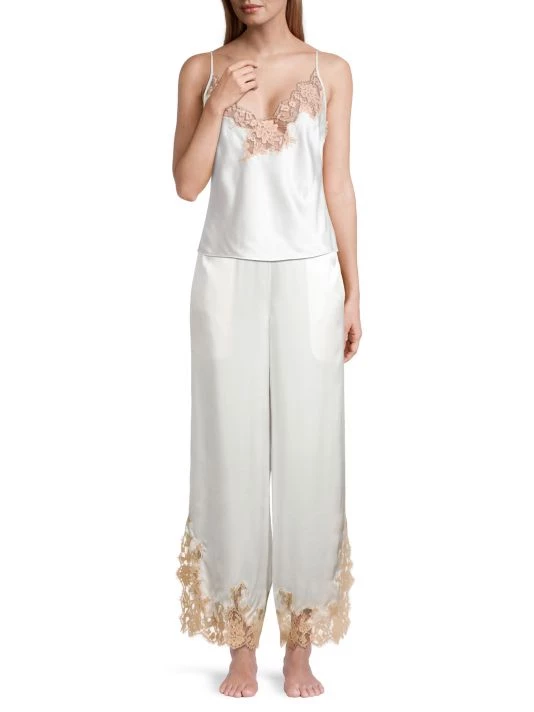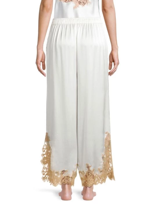 Beautiful floral lace trims these luminous silk wide-leg cropped lounge pants.