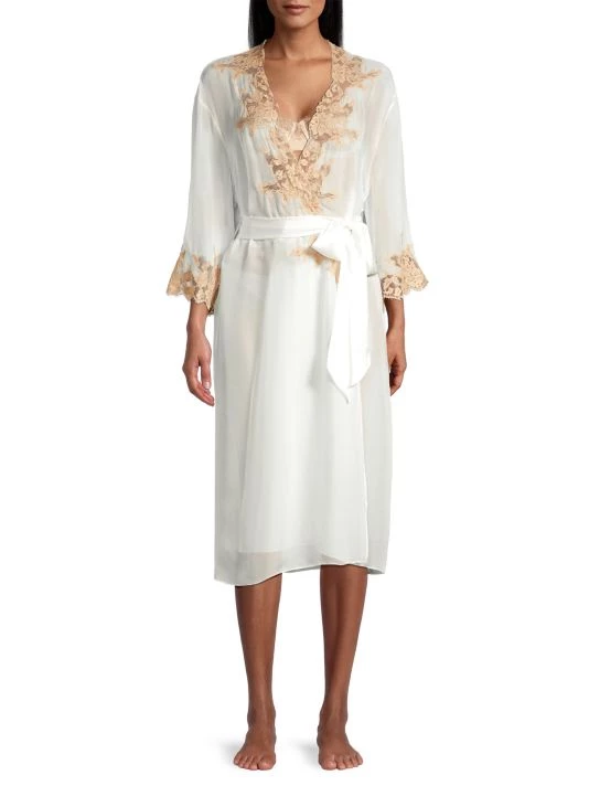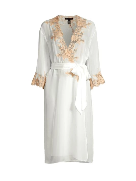 Lightweight silk robe with an ethereal feel and beautiful floral lace trim.