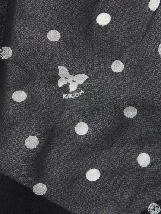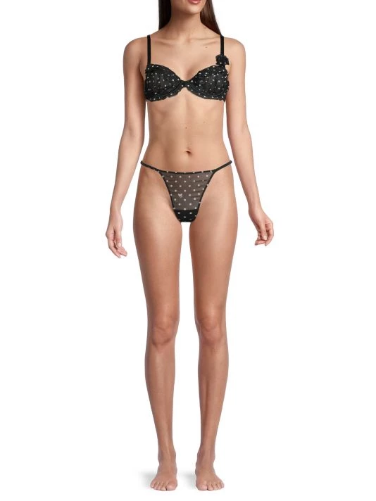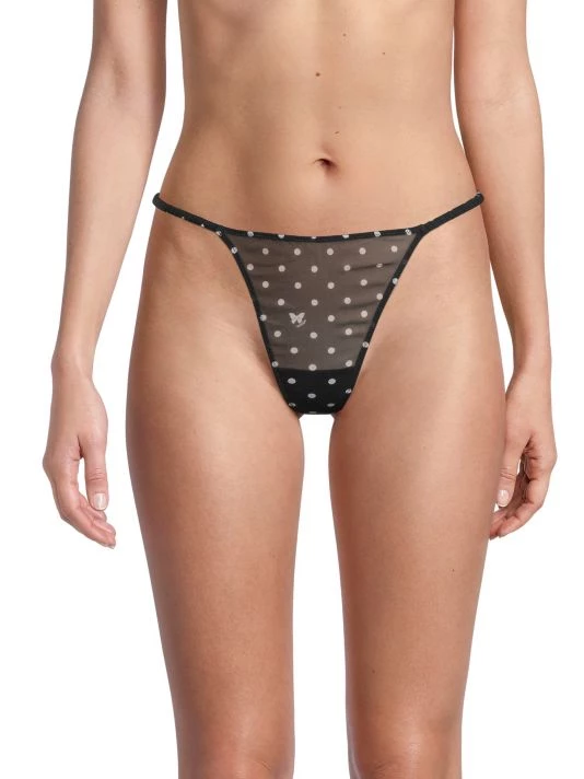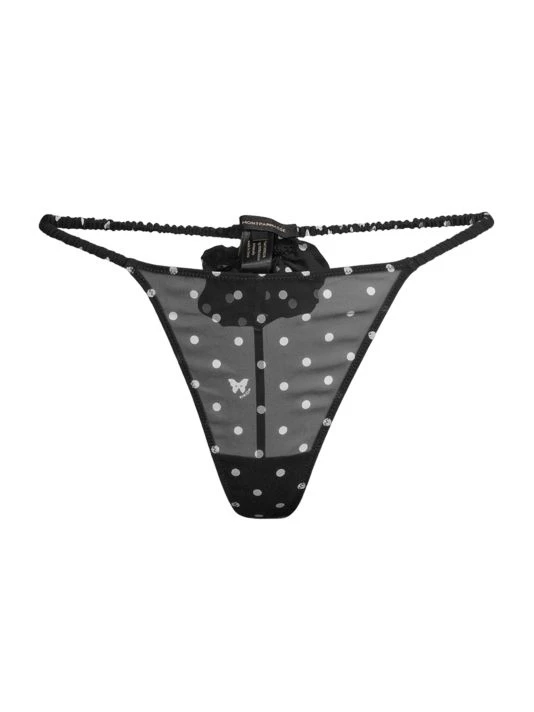Polka dot g-string thong with a fine silk fabrication and sweet ruffle back trim.