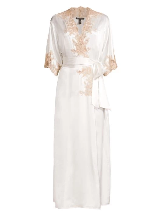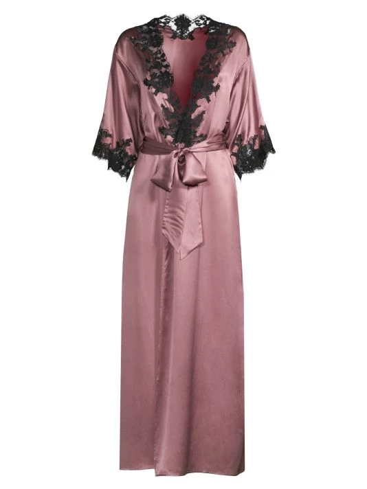 This robe is crafted of flowing silk with a delicate lace trim.
