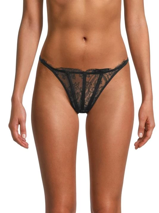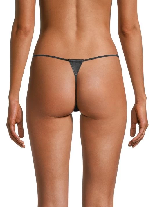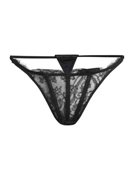 Crafted of intricate lace, this stringy thong by Kiki de Montparnasse offers luxe leather detailing at the back.