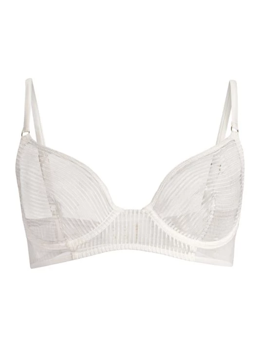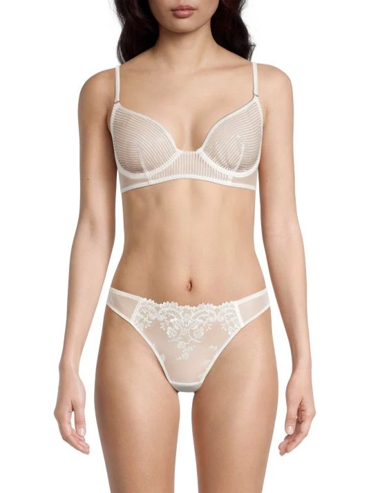 Kiki de Montparnasse’s striped lace demi bra features adjustable straps, a V-neck, and underwire support.