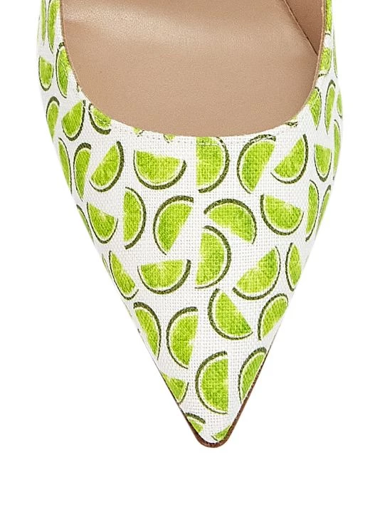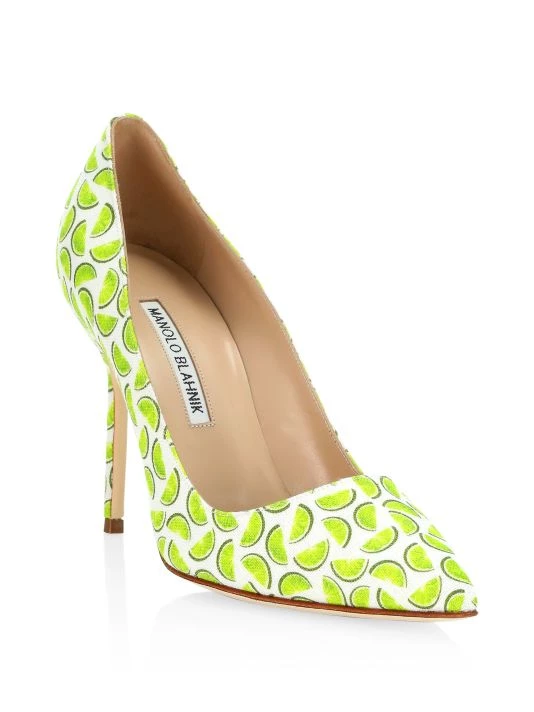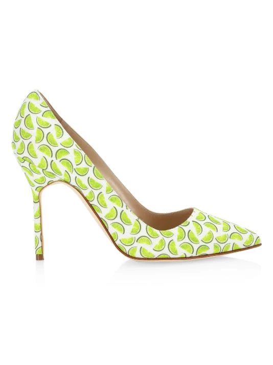 Manolo Blahnik’s BB pumps are crafted of lime-printed linen.