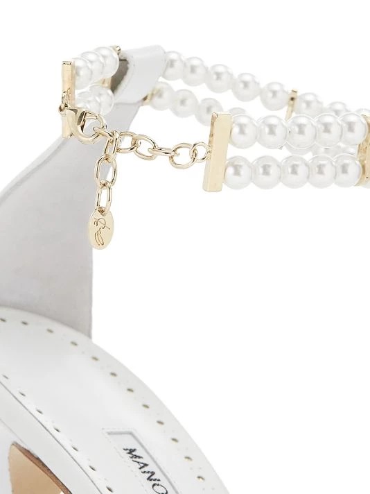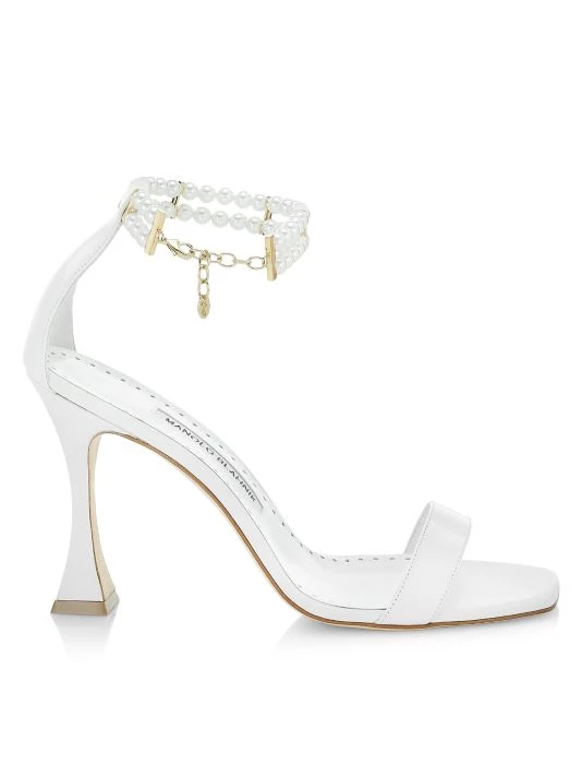 The Charona sandals from Manolo Blahnik are crafted of smooth leather with a faux pearl ankle bracelet.