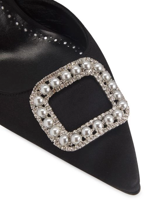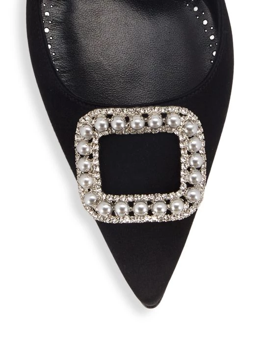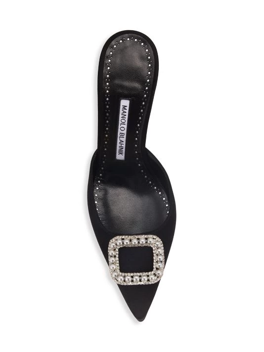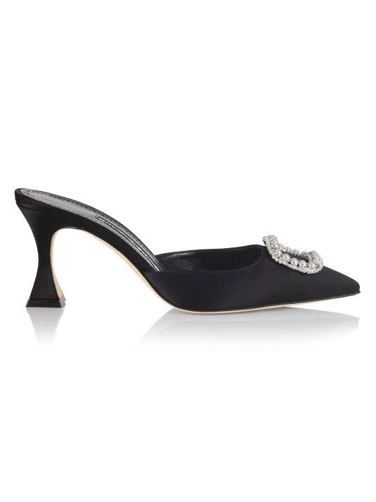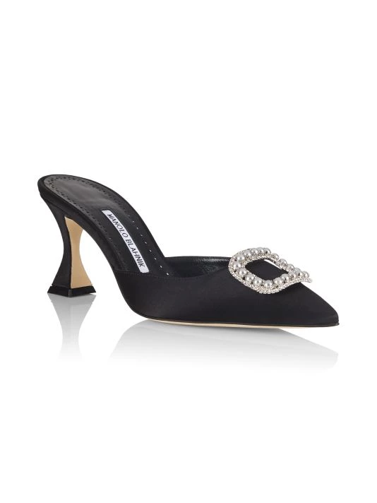 Taking inspiration from art patron Rita de Acosta, Manolo Blahnik’s Fabetamu mules feature a signature buckle adorned with lustrous crystals and pearls. A flared heel elevates this romantic pair made in Italy of soft satin.