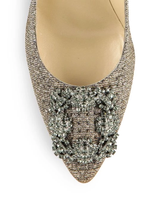 - Stunning shimmer pump with signature crystal buckle at toe