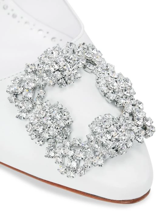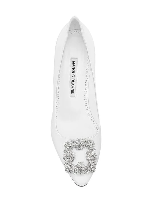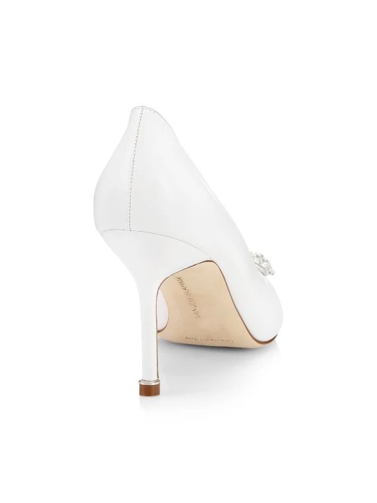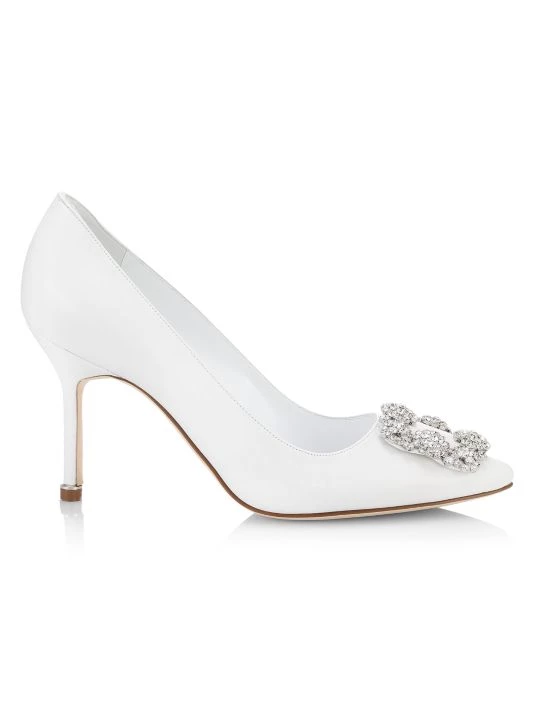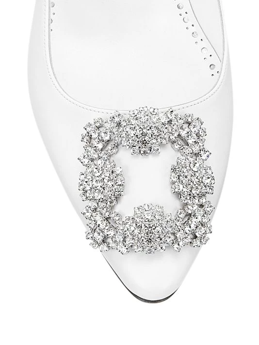 Timeless leather pumps with Manolo’s signature crystal-encrusted buckle at the toe.
