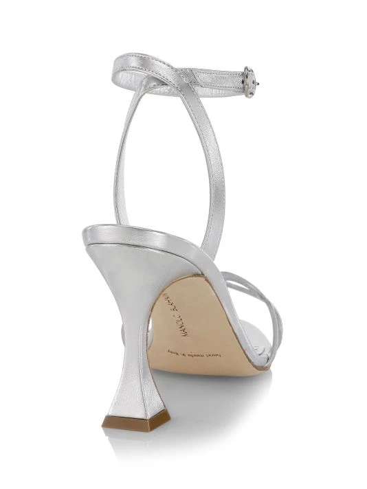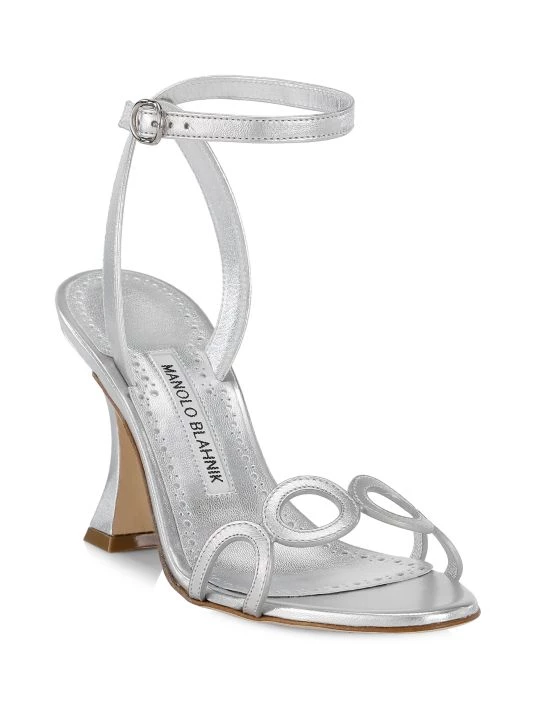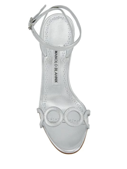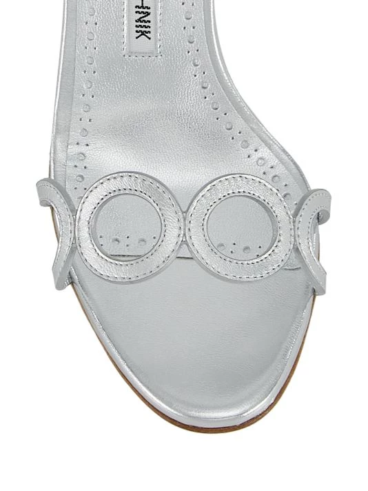 Manolo Blahnik’s Kamistra sandals are crafted of metallic leather with circular details at the toe strap.