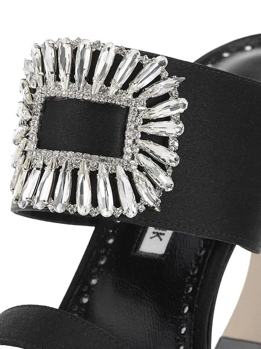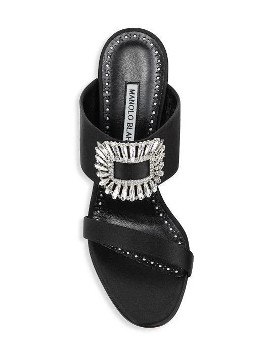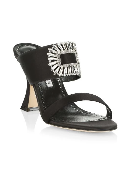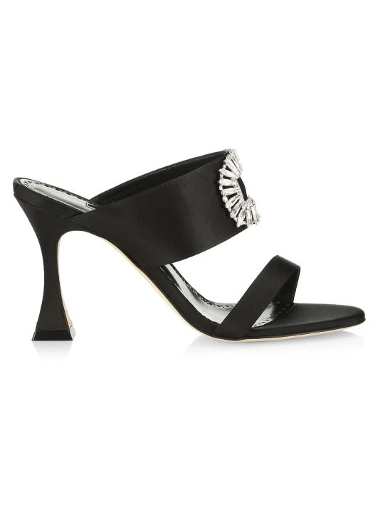 Manolo Blahnik’s Laali mules are crafted of luxe satin with a crystal-embellished buckle.