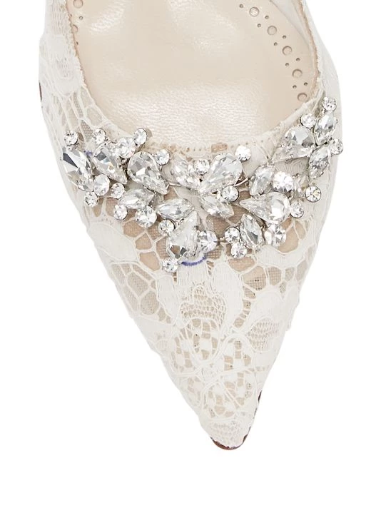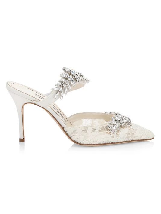 Delicate lace details the vamp of these mules while crystals embellish the ankle strap.