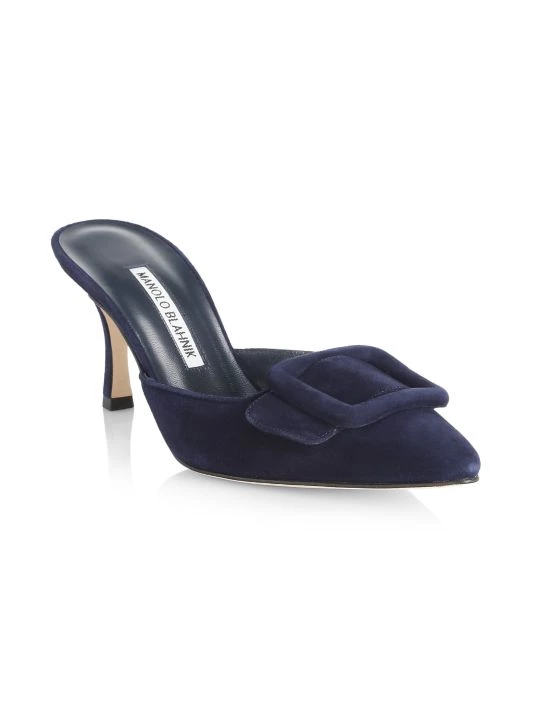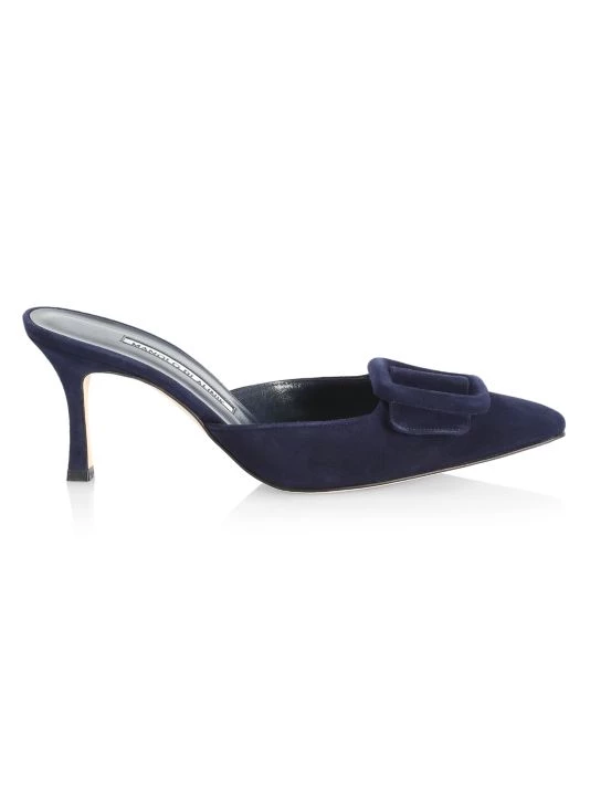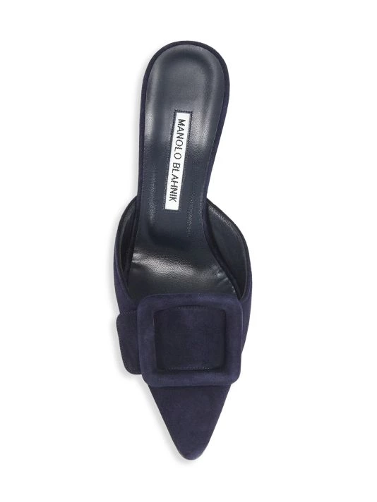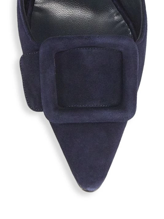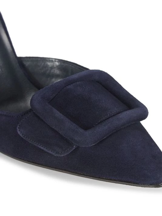 Luscious suede mules in a sleek point-toe silhouette accented with tonal buckle trim.