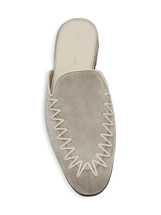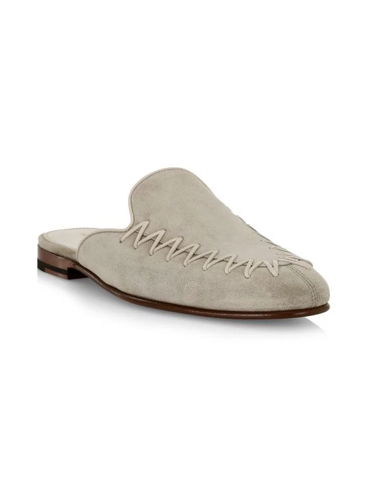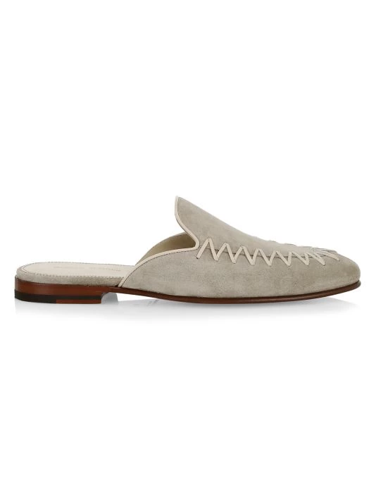 These suede slip-on mules feature decorative leather stitching along the vamp.