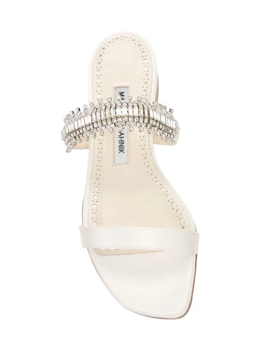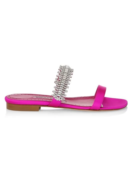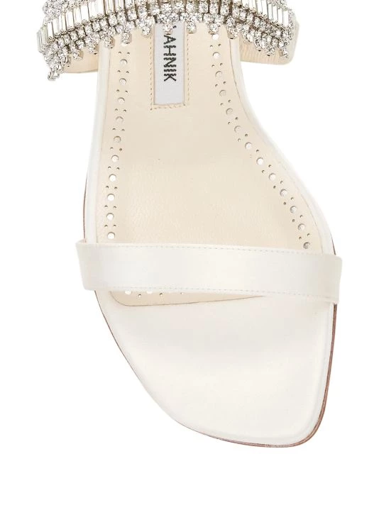 Light-catching crystals adorn the strap on these satin sandals evoking timeless elegance.