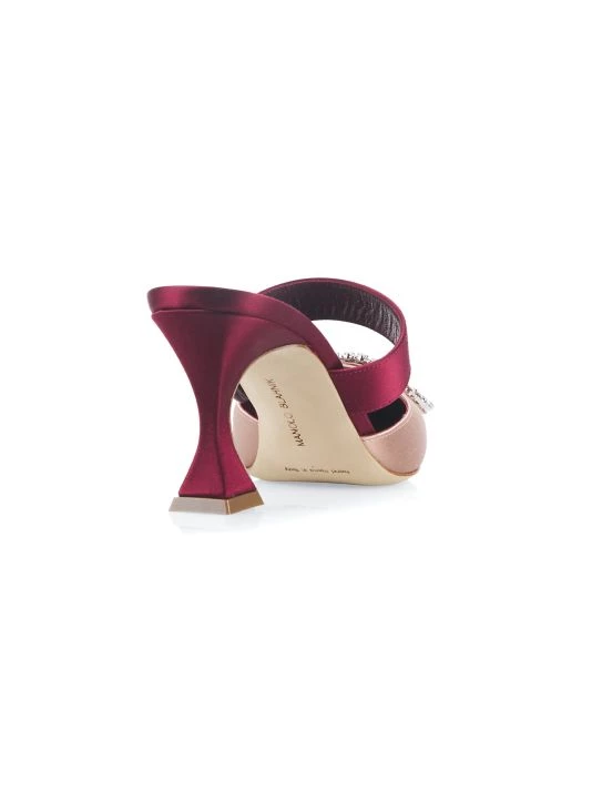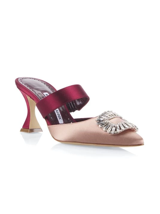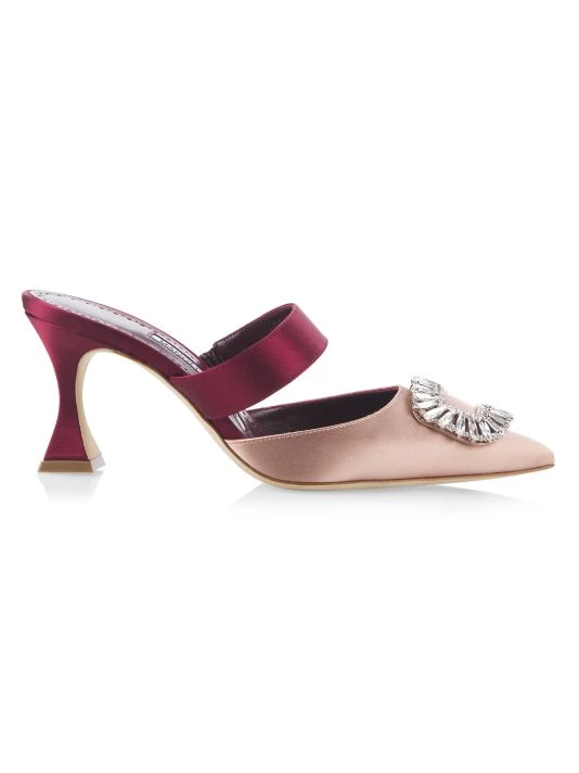 Made in Italy, Manolo Blahnik’s Scapetamu mules are crafted of colorblocked satin styled with a lustrous crystal-embellished buckle. This point-toe pair is anchored by a sculptural flared heel.